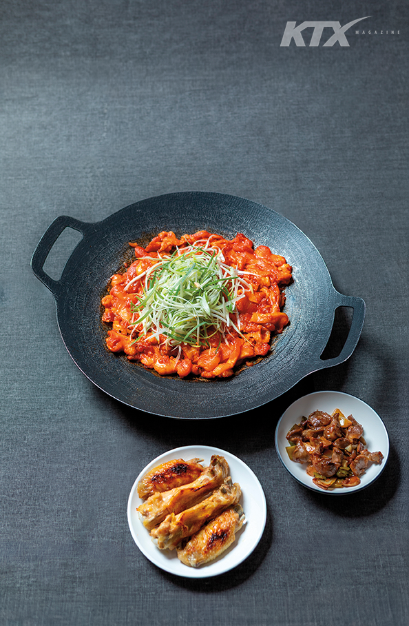 해남읍 돌고개 일원에는 닭 요리 전문 식당이 늘어선 해남 토종닭 요리촌이 있다. 이곳에서 알아 둬야 할 단어는 ‘통닭’. 기름에 튀긴 프라이드치킨을 말하는 것이 아니라, 닭 한 마리를 통째로 먹는다는 뜻이다. 주물럭부터 닭 가슴살 육회, 닭똥집 볶음 등 닭 한 마리가 무한 변신해 상을 가득 채운다. 요리촌에 모인 식당들은 하나같이 ‘토종닭’, ‘닭 코스’를 간판에 내걸고 있다. 그중 유일하게 ‘원조’에 힘을 준 ‘원조장수통닭’에 들어섰다. 이곳의 역사는 50여 년 전 코카상회로 거슬러 올라간다. 비포장 외길에서 달걀과 음료를 팔며 오가는 사람들의 허기진 배를 채워 주던 점방. 단골들의 제안으로 닭 요리를 팔기 시작했는데 반응이 꽤 좋아 1987년 정식으로 닭 요리 전문 식당을 열었다. 그사이 퍽퍽한 닭 가슴살로 주물럭과 육회를 만들며 색다른 조리법에 도전해 한 상을 가득 채울 만큼 닭 요리 가짓수가 늘어났다.