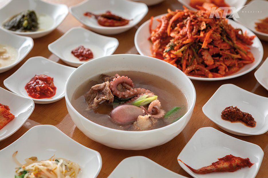 월출산에서 기를 충전했다면, 이제 맛있는 음식으로 배를 채울 차례. 영암 여행을 계획하며 꼭 방문하고 싶은 곳이 있었다. 바로 읍내에 자리한 독천낙지거리. 지금이야 평범한 거리지만 과거 이곳에서는 큰 우시장이 열렸다. 근처 미암면 일대에는 영산강 하굿둑이 건설되기 전까지 너른 갯벌이 펼쳐진 갯마을이 있었다. 1970년에 문을 연 독천식당 대표는 우시장에서 갈비탕을 팔다가 근처 상인들이 좌판에 낙지를 펼쳐 놓은 모습을 보고 갈비탕에 낙지를 넣어 보았다. 이것이 독천낙지거리의 대표 음식인 갈낙탕의 탄생 배경이다. 이후 2010년 음식 문화 개선 시범 거리로 지정되면서 독천식당 일대는 ‘독천낙지거리’라 불리게 됐다. 갈낙탕을 처음 만든 ‘독천식당’은 3대째 전통을 잇고 있다. 대표 메뉴인 갈낙탕부터 낙지 초무침, 낙지 연포탕, 낙지구이 등 다양한 낙지 요리를 선보이고, 직접 만든 젓갈류로 밑반찬을 낸다. 갈낙탕에 들어가는 쇠고기는 식당을 오픈했을 때부터 지금까지 영암에서 나고 자란 국내산 육우만 사용한다. 진한 국물에 갈빗대와 낙지가 통째로 들어가 보기만 해도 건강해지는 기분이 든다. 신선한 채소와 통통한 낙지, 깊은 맛의 양념이 어우러진 낙지 초무침도 별미. 입맛을 돋우는 새콤달콤한 양념은 물론, 아삭하고 쫄깃한 식감도 먹는 재미를 더한다.