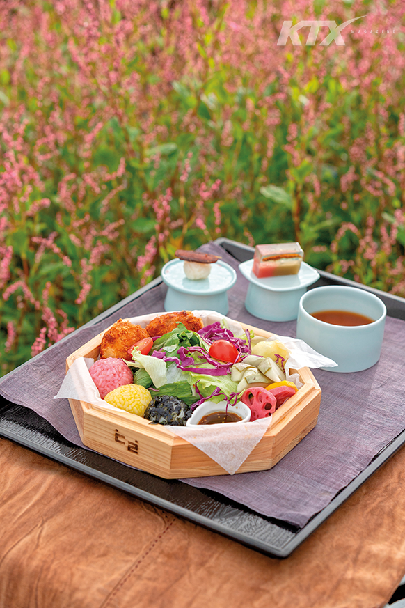 월출소반 도시락 뚜껑을 여니 알록달록한 음식이 소담스레 담긴 모습이 마치 한 다발의 꽃 같다. 영암에서 난 양상추 샐러드에 영암 특산품인 무화과로 만든 드레싱을 곁들이고, 검정·분홍·노랑의 삼색 주먹밥은 영암 쌀과 농산물로 선명한 색과 맛을 냈다. 무화과로 재워 식감이 부드러운 볼카츠도 예담은에서 개발한 별미다. 여기에 영암의 또 다른 특산물 멜론으로 만든 아삭한 장아찌가 중간중간 입안을 개운하게 해 준다. 도시락 옆 작은 도기에는 임금님 진상품으로 알려진 어란을 얹은 미니 주먹밥과 영암 멜론, 대봉감, 고구마 등 제철 재료로 만든 양갱이 오른다. 영암의 맛을 생생하게 즐기는 진귀한 경험이다.