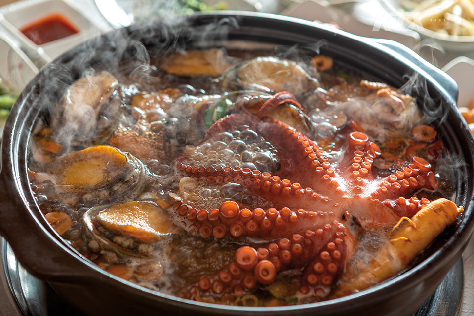 한약재를 우려 전복과 문어, 토종닭을 넣고 푹 끓인 회춘탕.