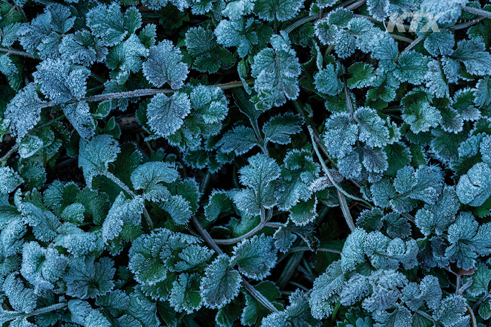 된서리 맞은 들풀이 얼음에 갇혔다.