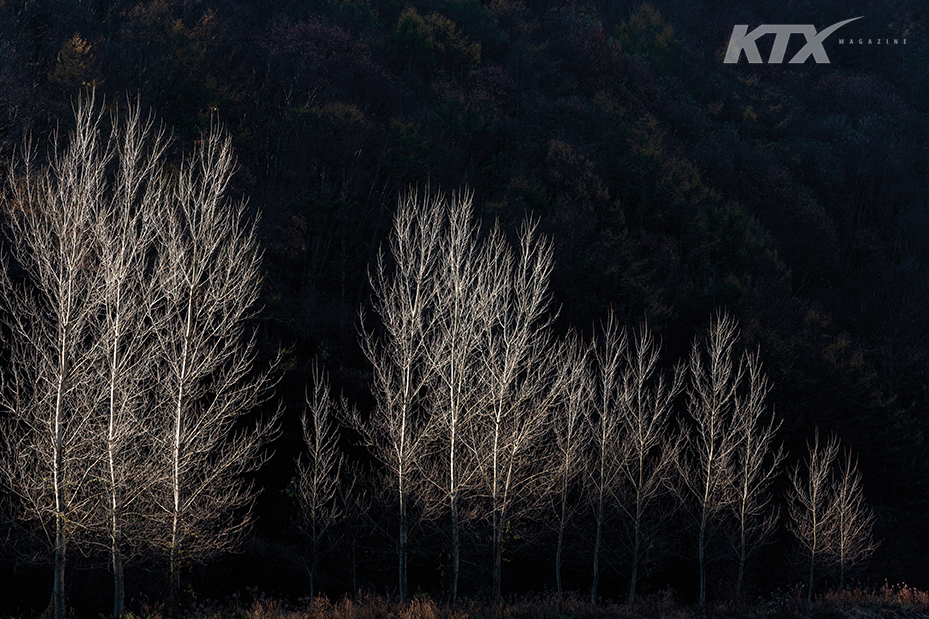 산그늘이 검은 장막을 드리우고, 은사시나무에 햇살이 부서진다.