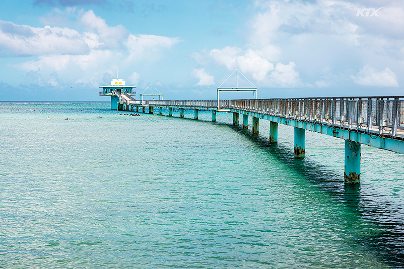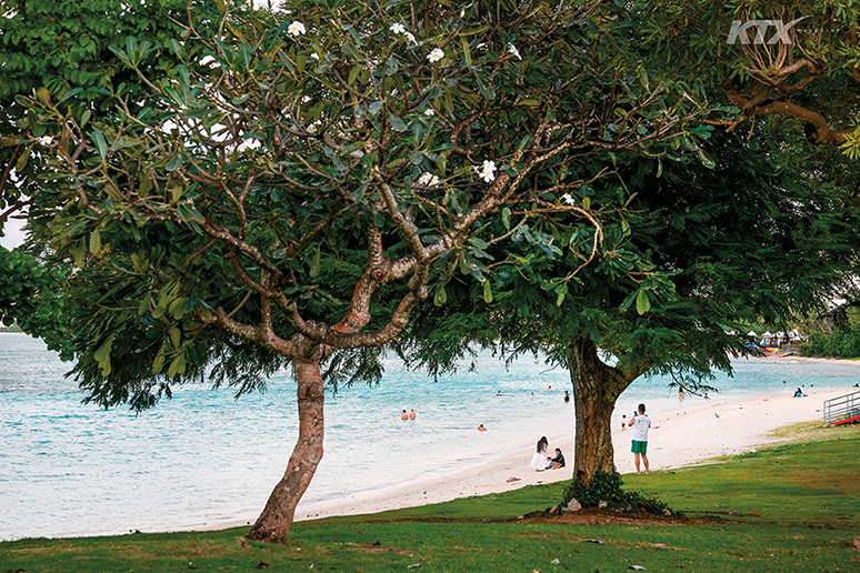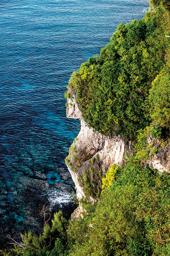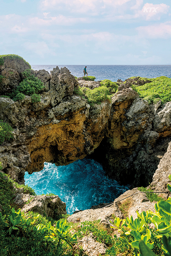 동굴 탐험을 무사히 끝낸 후에는 사랑의 절벽(Two Lovers’ Point)에서 달콤한 휴식을 취할 차례다. 타무닝 지역 북쪽, 투몬 베이와 마주한 사랑의 절벽은 현지인도 즐겨 찾는 선셋 포인트다. 122미터 높이의 전망대에 오르면 온순한 열대 휴양지로만 여겼던 괌이 장대한 대자연의 모습으로 다가온다. 사랑의 절벽이란 이름은 차모로족의 구전설화에서 비롯됐다. 차모로족 여인이 한때 괌을 장악한 스페인 장교와의 강제 결혼을 피하기 위해 연인과 머리를 묶고 절벽에서 바다로 뛰어내렸다는 이야기가 전해진다. 전망대 위 바다와 마주 보는 위치에서 오른쪽에는 여자의 옆태를 빼닮은 절벽이, 왼쪽에는 남자의 옆얼굴과 비슷한 해안선이 자리한다. 죽어서도 서로 마주 보는 연인의 모습을 숨은그림찾기 하듯 더듬다가 발아래로 시선을 떨어뜨리면, 짙푸른 감청빛 바다와 절벽 아래에서 거세게 파도가 부서지며 만들어 내는 포말이 눈에 들어온다. 태평양에서 가장 깊은 바다, 마리아나 해구 한복판에 서 있다는 사실을 실감하는 순간이다.