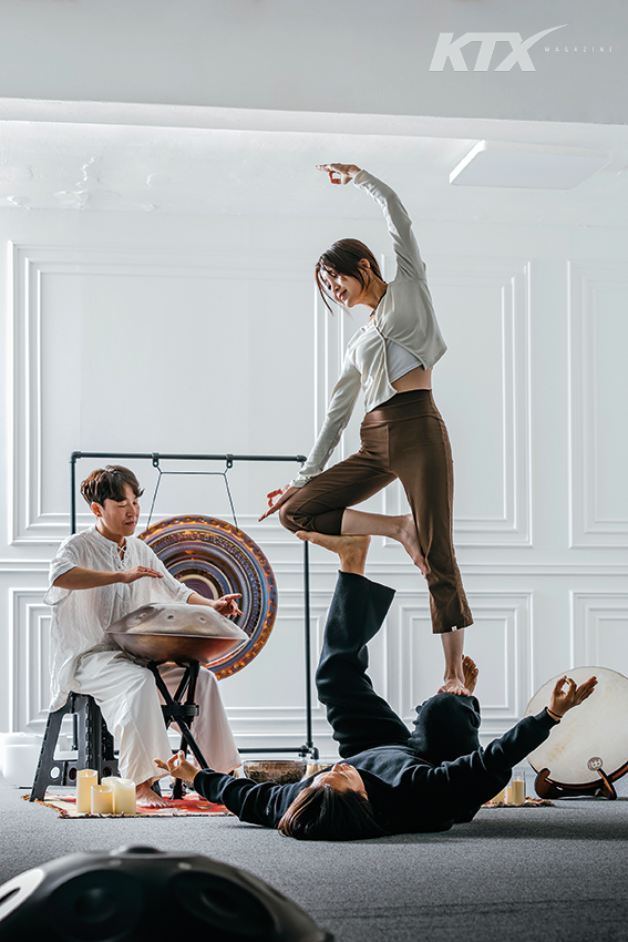 수업이 끝난 뒤 수강생들이 하택후 연주가에게 자작곡 연주를 요청했다. 강습실이 공연장이 되는 순간이다. 아티스트와 관객들의 표정에 즐거움이 가득하다. 하택후 연주가는 핸드팬과의 만남이 자신의 삶에 터닝 포인트가 됐다고 말한다. “한때는 누가 나를 어떻게 보는지가 삶의 척도일 만큼 중요했어요. 공연에 대한 만족감보다는 타인의 평가가 더 신경 쓰였죠. 신비로운 핸드팬 소리를 많은 이들이 반겨 주니 이젠 제 연주에만 몰입하죠.” 이제 요가원은 소수의 관객과 교감하는 무대이자 마음을 회복하는 장소가 됐다. 기댈 구석이 필요하다면 각자의 에너지에 맞는 악기를 찾아보는 건 어떨까. 악기가 들려주는 소리는 나의 동작에 대한 답변이자 자신과의 대화이기도 하다. “모든 소리엔 공명이 있잖아요. 그 소리에 집중하는 게 바로 명상 아닐까요. 핸드팬의 울림이 잦아드는 끝을 바라보며 자기 소리를 찾아내는 거예요.” 내 안의 감정이 핸드팬을 통해 조금씩 흘러나오기를 가만히 기다려 줄 차례다.