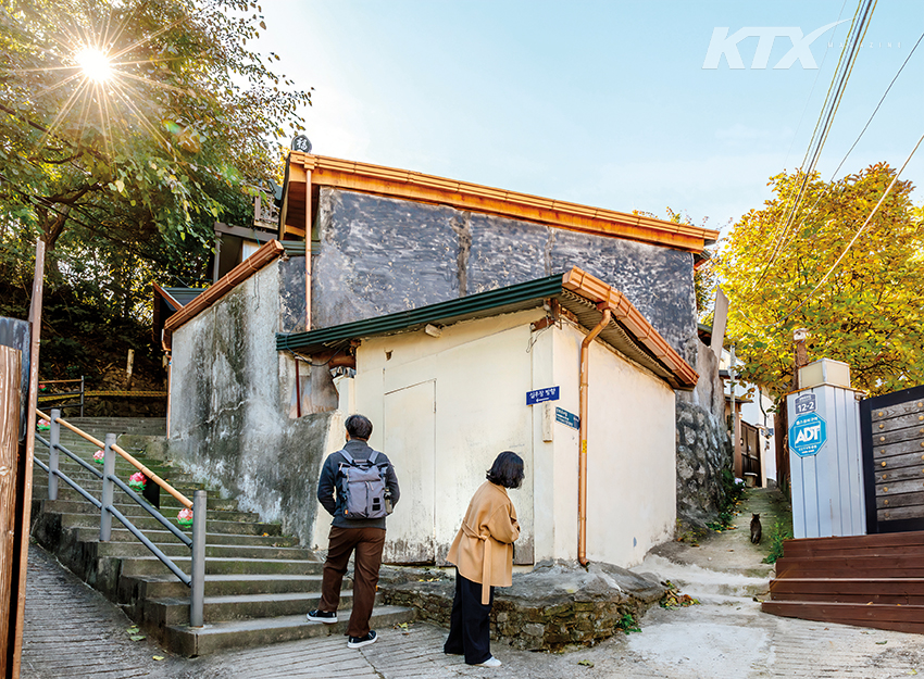 심우장을 나와 북정마을을 거니는 동안 정 작가가 익숙한 풍경을 해석하는 방법을 귀띔해 준다. “자세히 보면 같은 지붕인데 부분 부분 자재가 달라요. 나중에 지붕이 무너지거나 손상돼 일부를 수리했을 거예요.” 설명을 듣고 나니 마을 모습이 일부를 확대한 것처럼 또렷하고 세세하게 다가온다. 건물에 연결된 초록색 사다리는 빈 공간에 항아리나 화분을 올려 두려고 설치했을까? 도로명 주소 판 아래 적힌 ‘휙’이라는 낙서는 그 앞을 빠르게 지나가는 사람을 떠올리며 그린 건 아닐까? 마을 주민들의 의도를 상상하며 걷는 과정도 즐겁다. 집에 드나들기 편하도록 담벼락을 뚫어 문을 하나 더 낸 것도 강렬한 인상을 남겼다. “이런 걸 건축가 없는 건축이라고 표현해요. 살면서 필요한 요소를 하나둘 덧붙이다 보니 흡사 설치미술 같기도 한 독특한 건축물이 된 거죠.” 종이에 간직하고 싶은 장면이 많아 자꾸만 발걸음을 재촉하게 된다.