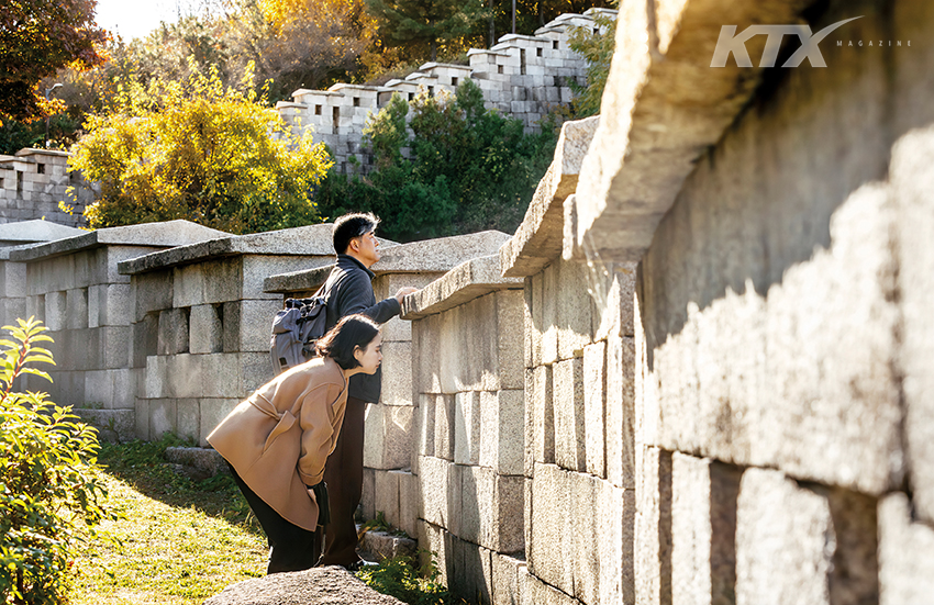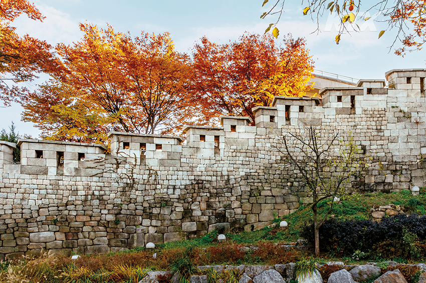 성북역사문화공원으로 내려가면 성곽의 돌 하나하나를 자세히 관찰할 수 있다. 이 돌의 크기와 모양에 따라 축성 시기가 구별된다. 태조 때는 자연석을 거칠게 갈아 사용했고, 숙종 때부터 정방형에 가까운 형태의 돌을 쌓았다. 돌 색깔도 각기 다른데, 상대적으로 흰빛을 띠는 건 복구 작업을 하며 갈아 끼운 돌일 확률이 크다. “흑백 그림에 나뭇잎만 색을 칠한 것 같네요.” 펜 드로잉 위주로 작업한 뒤 포인트 컬러를 넣는 정연석 작가의 눈에는 잿빛 성곽과 그 뒤로 모습을 드러내는 단풍나무가 또 다르게 보이나 보다.
