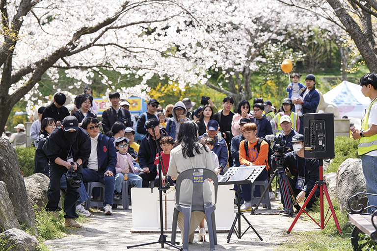 목포 시민에게는 일상의 풍경이자 여행객에게는 반드시 들러야 할 곳으로 유달산을 빼놓을 수 없다. 목포 시내와 다도해가 한눈에 보이는 명소로, 매년 봄이면 유달산 경치를 만끽하는 축제가 열린다. 올해 유달산 봄축제는 ‘쉼’을 키워드로 누구나 부담 없이 즐기기 좋은 프로그램을 마련했다. 돗자리에 앉아 김밥과 샌드위치, 솜사탕 등을 먹는 봄 소풍과 둘레길 곳곳에 숨겨진 보물을 찾는 프로그램은 동심을 불러 일으킨다. 산책하듯 걷기 좋은 유달산 둘레길에는 이순신 장군 동상과 가수 이난영의 노래비, 연인들의 포토존으로 사랑받는 연리지 소나무, 전설을 품은 기암괴석 등 시선을 붙드는 명소가 이어진다. 대학루와 달선각, 유선각 등 산책길 중간중간 자리한 정자에 앉아 잠시 쉬어 가기도 좋다. 축제의 순간을 오래 간직하기 위해 봄꽃으로 꾸민 포토존에서 인증 사진을 남기는 일은 필수다. 유달산 코앞에 위치한 노적봉예술공원에도 즐길 거리가 풍성하다. 시립 예술 단체의 공연과 시니어 합창단, 지역 예술인의 버스킹이 축제 분위기를 한층 끌어올리고, 봄꽃 비즈 링 및 화관 만들기, 봄꽃 편지 쓰기 등 체험 콘텐츠도 즐거움을 더한다.