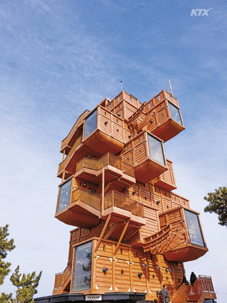 목포 앞바다에 길게 누운 용의 형상을 닮아 ‘용섬’이라 불리는 고하도로 향하는 길은 어렵지 않다. 차로 목포대교를 건너거나 해상 케이블카를 이용하면 금세 닿는다. 고하도 산책로를 따라 정상에 오르면 목재 블록을 엇갈려 쌓아 올린 듯한 이색적인 건축물이 시선을 사로잡는다. 거대한 나무 성채이자 현대미술 작품을 연상시키는 이 건축물은 고하도 전망대다. 명량해전에서 판옥선 열세 척으로 왜군을 무찌른 충무공 이순신 장군의 정신을 기리기 위해 세웠다. 고하도는 충무공이 106일간 머물며 군량미를 비축하고 판옥선을 재건해 전력을 가다듬은 전략적 거점이기도 하다. 1597년 보화도(지금의 고하도)에 배를 정박한 이순신 장군은 <난중일기>에 “서북풍을 막을 만하고 배를 감추기에 아주 적합했다”고 기록했다. 전망대에 오르면 사방이 시원하게 트인 조망과 함께 은폐에 유리한 섬의 지형이 한눈에 들어와 이곳이 군사적 요충지였음을 저절로 이해하게 된다. 안으로 들어서면 고하도 역사와 목포의 문학인들, 권역별 관광 정보를 소개하는 전시가 층층이 이어진다. 창밖 풍경 또한 층마다 각기 다른 매력을 선사한다. 낮은 층에서는 고하도의 푸른 숲과 완만한 해안선이 눈앞에 펼쳐지고, 위층으로 오를수록 목포대교와 다도해의 섬들이 시야를 채운다. 어렴풋이 들리는 파도 소리를 따라 전망대 아래 해상 데크로 내려서면 풍경은 한층 생생하게 다가온다. 목포대교가 놓인 용머리 방향에는 전장을 지휘하듯 기개 넘치는 이순신 장군 동상과 하늘 위로 비상하는 듯 생동감 넘치는 은빛 용 조형물이 자리하고, 반대편에는 1940년대 태평양전쟁 당시 일본군이 조성한 해안 동굴이 남아 있다.