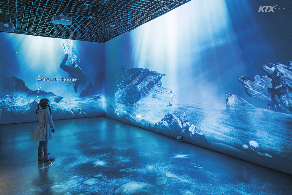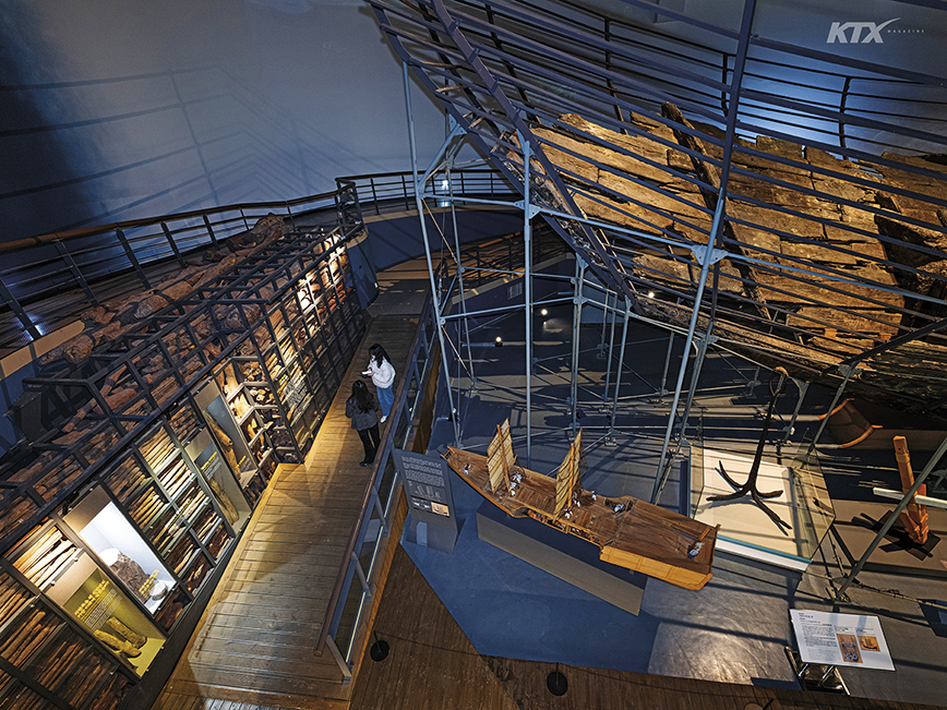 1975년 여름, 전남 신안 앞바다에서 조업 중이던 한 어부의 그물에 청자 여섯 점이 걸려 올라왔다. 도자기의 정체는 14세기에 동아시아 바닷길을 오가던 대형 무역선 ‘신안선’의 유물이었다. 보물선의 존재가 알려지자 전국에서 도굴꾼이 몰려들었고, 이듬해 정부가 유물 보존을 위해 신안선 수중 발굴에 착수했다. 이후 수중 발굴한 해양 유산을 지키기 위해 1994년 영산강 하구 인근에 목포해양유물전시관을 열었다. 이곳은 네 개의 상설전시실과 기획전시실, 어린이체험관으로 구성되었다. 1층 제1전시실에는 십이공파도선, 달리도선, 완도선 등 세 척의 고려 난파선을 전시해 고려 시대의 활발한 해상 운송 체계와 교역 규모를 체감할 수 있도록 했다. 철제 프레임 안에 남은 선체의 목재 조각으로 배의 크기와 형태를 어렴풋이 그려 본다. 청자와 짚을 번갈아 쌓아 포장한 도자기 꾸러미에서 생활의 지혜가 읽히고, 솥과 장기 알, 나무 빗 같은 유물은 바다 위 뱃사람들의 일상을 상상하게 한다. 전시의 하이라이트는 제2전시실이다. 복원된 신안선 실물 앞에 서는 순간, 압도적인 규모에 그대로 몸이 얼어붙는다. 한눈에 담기지 않는 거대한 선체를 따라 걸으며 송·원대의 고급 자기와 28톤에 달하는 동전, 1017개의 자단목, 동남아시아산 향신료 등 신안선에 실려 있던 유물을 차례로 구경한다. 전시실 끝까지 이어지는 유물들은 신안선이 누비던 동아시아 바닷길이 문화와 물자가 오가던 거대한 네트워크였음을 증언한다. 전시는 2층으로 이어진다. 제3전시실에서는 디지털 실감 영상을 통해 생생한 수중 발굴 현장을 마주하고, 제4전시실에서는 한국 전통 배 ‘한선’의 구조와 제작 과정을 인터랙티브 콘텐츠로 살펴본다.
