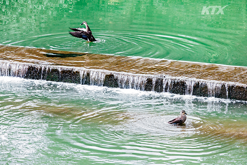이번에는 새싹교를 건너다가 바로 아래에서 목욕을 즐기는 주황색 다리의 흰뺨검둥오리 두 마리를 만난다. 수중에서 날갯짓하며 머리를 물속에 담갔다 올리기를 반복하더니, 물가로 올라와 부리로 목, 옆구리, 날개깃 사이를 콕콕 쑤신다. 그것도 아주 열심히. “깃털에 기름칠을 하는 거예요. 보통 새 꽁지에서 기름이 나오는데요. 목욕하고 난 뒤 축축해진 깃털을 기름칠한 부리로 가지런히 정리하는 거죠. 물에 뜨기 위한 생존 방식이에요.” 다종다양한 새의 행동 양식을 유심히 살펴보니 새들이 사는 세상을 조금은 이해하게 된다.