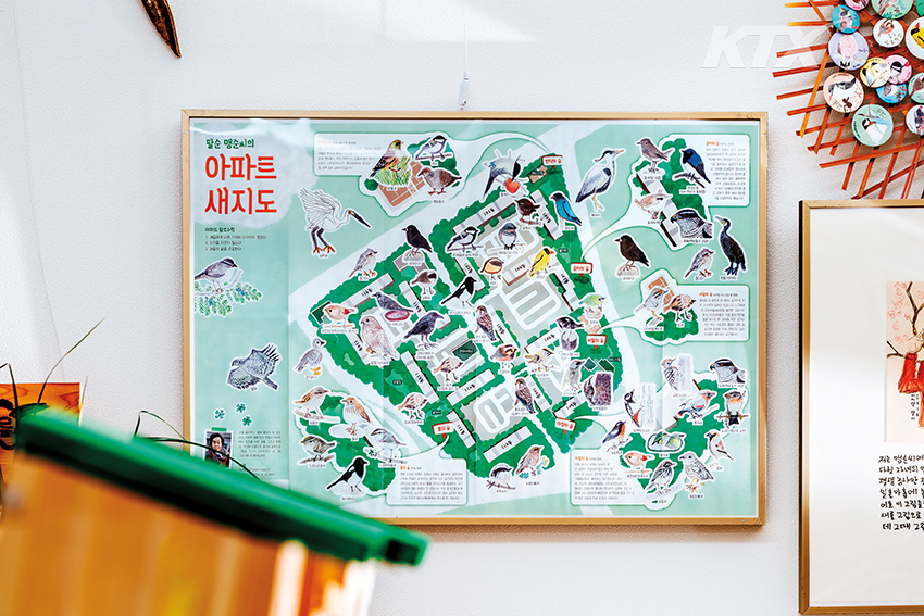 박 대표의 어머니인 맹순 씨 그림으로 만든 ‘아파트 새 지도’. 2020년 한 해 동안 아파트에서 관찰한 새 47종의 그림이 담겨 있다.