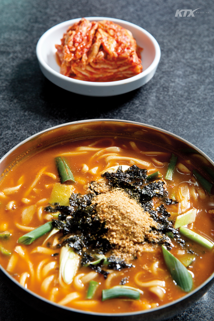 여기에 멸치, 다시마, 가다랑어 포 등을 넣어 우려낸 육수를 더해 깊은 감칠맛을 완성한다. 채소는 배추, 대파, 애호박, 양파 등을 넣고 때로는 두부나 감자를 곁들여 한층 풍성한 식감을 자랑한다. 붉은 국물에 칼로 썬 면발이 담긴 모습은 얼핏 매운탕이나 찌개를 연상시키지만, 한 숟가락 떠먹는 순간 부드럽고 진한 감칠맛에 깜짝 놀라게 된다.