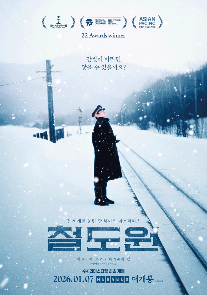 겨울의 정취를 대표하는 명작 <철도원>이 10년 만에 4K 리마스터링으로 다시 관객을 만난다. 도시와 시골을 잇는 호로마이역에서 철도원으로 살아 온 오토가 눈 내리는 새해 아침, 플랫폼에서 낯선 소녀와 마주하며 이야기가 시작된다. 홋카이도의 눈부신 설경을 배경으로 직업에 대한 사명감과 삶에 대한 성찰을 세밀하게 담아냈다. 1월 7일 개봉.