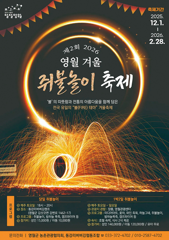 쥐불놀이는 논두렁을 태워 해충을 없애고 풍년을 기원하던 한국의 민속놀이다. 영월군 농촌관광협의회와 동강리버버깅협동조합이 사라져 가는 전통을 잇기 위해 현대적으로 재해석한 쥐불놀이 축제를 개최했다. 참가자들은 깡통 속 불씨를 돌리고, 모닥불 주변에서 고구마나 마시멜로를 구워 먹으며 낭만적인 밤을 보낸다. 올해는 단순 야간 행사에서 끝나지 않고 체류형 관광으로 확장했다는 점이 주목할 만하다. 예밀와인 힐링센터에서의 족욕 체험, 유네스코 세계문화유산 장릉 탐방 등을 연계한 1박 2일 프로그램도 마련했다.