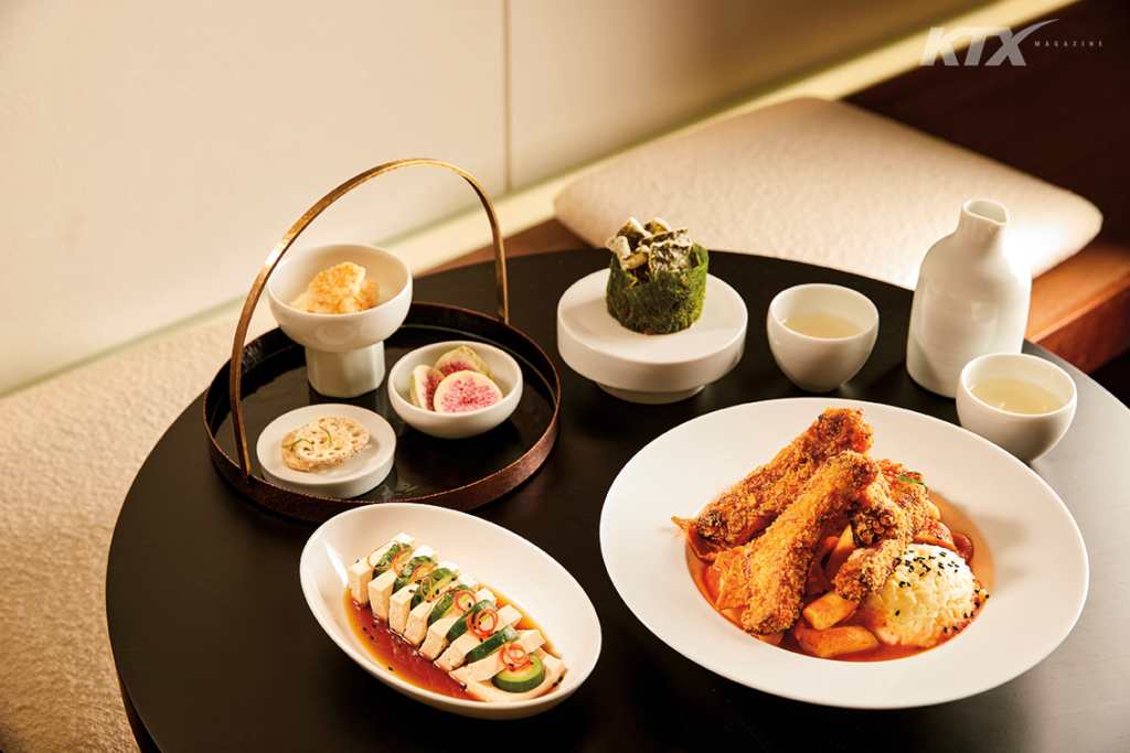 이 중 꼭 가 봐야 할 곳은 11층의 루프탑 라운지. 전주라는 지역적 특색을 반영한 모던 한식 바(bar)로, 문살과 마루, 디딤돌에 간접조명이 어우러진 인테리어가 한국적인 멋과 함께 신비로운 분위기를 자아낸다. 창가에는 툇마루를 모티브로 한 좌식 공간을 마련해 전통 한옥에 온 듯한 기분을 느낄 수 있다. 루프탑 라운지의 시그너처 메뉴는 ‘주안상’. 먹태, 누룽지 강정 등 한입거리 주전부리와 한우 감태 육회, 문어 달구지 튀김, 등갈비 떡볶이 등의 안주를 한 상 차림으로 제공한다. 종류가 다양하고 양도 꽤 많아 성인 남자 둘이 먹기에도 부족하지 않을 정도다. 여기에 배막샤 막걸리 칵테일이나 분홍 노을 막걸리 등 아이디어가 반짝이는 칵테일을 곁들이면 금상첨화. 색 조화와 플레이팅 등 보임새에도 심혈을 기울여 먹는 내내 귀하게 대접받는 기분이 든다. 라운지 야외 공간에는 전주 야경이 바라다보이는 테라스도 있어 주홍빛으로 물든 전주한옥마을을 한눈에 담을 수 있다.