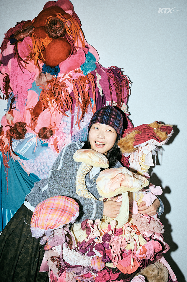 원래 패브릭 작업을 했어요. 유행 지난 청바지나 작아서 못 입는 옷으로 에코백이나 스커트를 만들어 본 경험이 있을 거예요. 저도 마찬가지예요. 대학교에 들어간 후에는 패브릭으로 손바닥보다 작은 오브제를 만들었죠. 졸업 전시에 출품할 작품을 고민하다가 좋아하는 작업의 크기를 키워 보기로 했어요. 재료를 찾기 위해 옷장을 뒤져 안 입는 옷들을 꺼냈죠. 초등학생 때 입던 옷, 학창 시절에 단체로 맞춘 ‘반티’ 같은 앞으로 절대 입지 않을 옷이 많았어요. 알록달록한 옷이 쌓여 있는 모습이 꼭 햄버거 같더라고요.