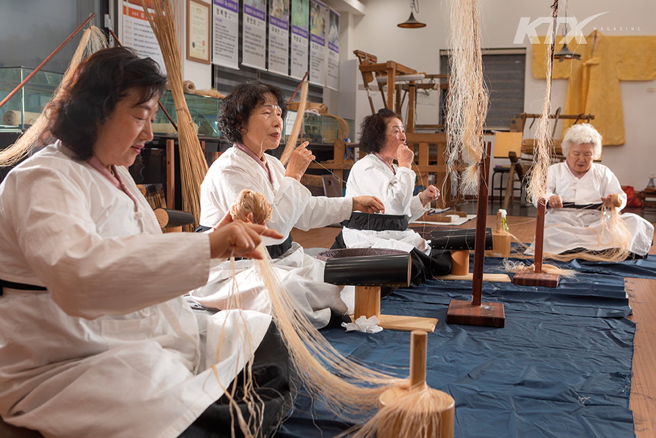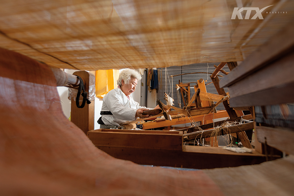 삼베가 탄생하는 과정을 살펴보기 위해 안동포짜기마을보존회 전수교육관으로 걸음을 옮겼다. 안으로 들어서니 전통 베틀에서 기다란 삼으로 안동포짜기 시연이 한창이다. 교육사인 박순자 할머니와 이수자인 고갑연·김영숙·남귀숙 할머니까지 모두 네 분, 안동포의 명맥을 잇는 안동포짜기마을보존회 어르신들이다. 멀리서 보면 한없이 여유로운 모습이지만 자세히 들여다보면 실을 고르는 손이 쉴 틈 없이 움직인다. 가까이 붙어 앉아 홀린 듯 지켜보고 있으니 할머니들이 옛이야기의 실타래를 훌훌 풀어놓는다. 과거 금소마을로 시집온 여인들은 대부분 안동포를 짰다. 절차가 복잡하고 고단해 이 지역으로 시집오기를 꺼렸는데, 듣고 보면 과연 그럴 만하다. 먼저 수확한 대마의 잎을 제거하고 증기에 쪄서 햇볕에 말린 뒤 껍질을 벗긴다. 겉껍질을 훑어 내 취한 속껍질을 일일이 손톱으로 째고 다시 훑어 낸다. 이렇게 만든 계추리를 햇볕에 말려 물에 적시는데, 이제부터 그야말로 고행이 시작된다. 삼 올을 이로 가늘게 쪼개어 뾰족하게 만든 후 허벅지에 비벼 이어야 하는 것. 한 번 잇는 삼의 길이는 무려 22미터에 달한다. 여기서 유래한 말이, 몸에 배어 익숙해진다는 뜻의 ‘이골이 나다’다. 이로 올을 쪼개는 과정을 반복하다 보니 금소마을 여인들의 이가 움푹 패어 골이 생긴 것. 쪼개진 삼을 허벅지에 멍이 들도록 비벼서 잇다 보니 다리도 성할 날이 없다. 베틀 앞에 앉아 지난한 시간을 견디며 어느덧 40~50년을 훌쩍 보냈다. 할머니가 된 금소마을 여인들은 지금도 손에 익은 베틀을 끌어안고 처음 배운 방식 그대로 안동포를 짠다.