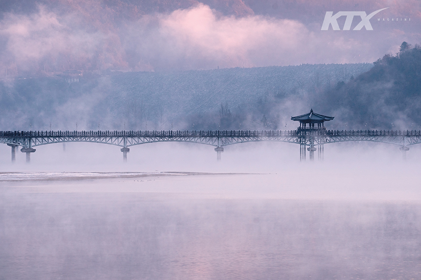 원도심에서 차로 약 8분 거리에는 안동 대표 관광 명소, 월영교가 자리한다. ‘달빛이 물에 비치는 다리’라는 뜻의 월영교는 날이 맑은 밤, 강물에 달이 둥둥 떠 있는 모습도 아름답지만 새벽녘 물안개가 피어오르는 풍경 또한 장관이다. 동이 틀 무렵 낙동강을 끼고 달려 월영교에 닿았다. 강을 둘러싼 검푸른 산 아래, 길이 387미터의 목조 교량이 물안개를 가로질러 뻗어 있다. 밤사이 산등성이를 타고 내려온 차가운 공기가 강물과 만나 피어난 안개가 점점 짙어지며 몽환적 분위기를 자아낸다.