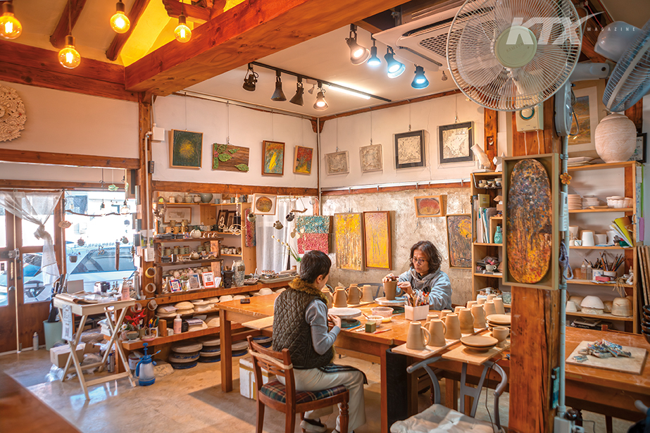 오후에는 예술 공방 체험이 이어진다. 다양한 분야의 예술가들이 모여 도자기 빚기, 재봉틀로 파우치 만들기, 민화 그리기, 책갈피 만들기 등 즐길 거리도 풍부하다. 그중 도자기 원데이 클래스를 운영하는 공방 ‘현도예’에서는 도자기에 그림 그리기, 물레 돌리기, 점토 빚기 등의 프로그램을 진행한다. “흙은 정직해서 손이 가는 대로 움직여요.” 김강현 대표의 말을 되새기며 차분하게 흙을 매만진다. 정성스럽게 다독이다 보니 매끈하진 않지만 세상에 하나뿐인 나만의 컵이 완성된다.
