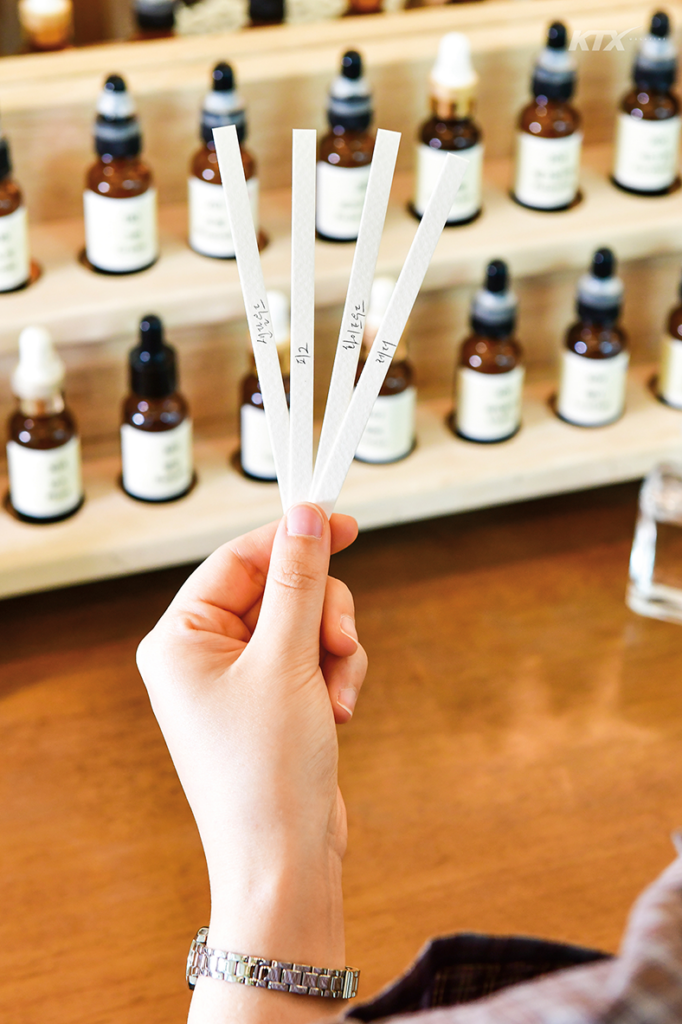 전문 조향사와 함께 취향을 알아 가는 체험 공간 라뷔공방에는 스스로를 탐색하는 사람들이 모인다. 향수, 방향제, 룸 스프레이, 핸드크림 등 원하는 종류를 선택하고, 향기 키워드를 적는 동안 자신이 그동안 끌렸던 향의 느낌을 떠올려 본다. 그다음 테이블에 놓인 약 서른 가지의 향료를 차례대로 맡으며 가장 마음에 드는 몇 가지를 정한다. 최종적으로 고른 향을 배합하는 샘플링은 3차까지 이어지는데, 이는 각자의 취향을 최대한 반영해 집에 가져가서도 자주 사용하도록 하기 위해서다. 그래서인지 향수를 다 쓴 뒤에 같은 제품을 다시 만들기 위해 재방문하는 손님이 많다. 체험 프로그램은 보통 1시간에서 1시간 반 정도 소요되며, 한 번에 24명까지 수용 가능해 단체 예약도 반긴다. 인상적인 점은 천안아산역을 만남의 장소로 정해 동창들끼리 방문하기도 한다는 것. 친구나 연인과 동행하면 상대에게 어울리는 향에 대해 이야기 나누며 더욱 친밀해질 수 있다. 자격증을 준비하거나 조향사를 지망하는 사람들을 위한 심화 과정 수업도 진행한다.