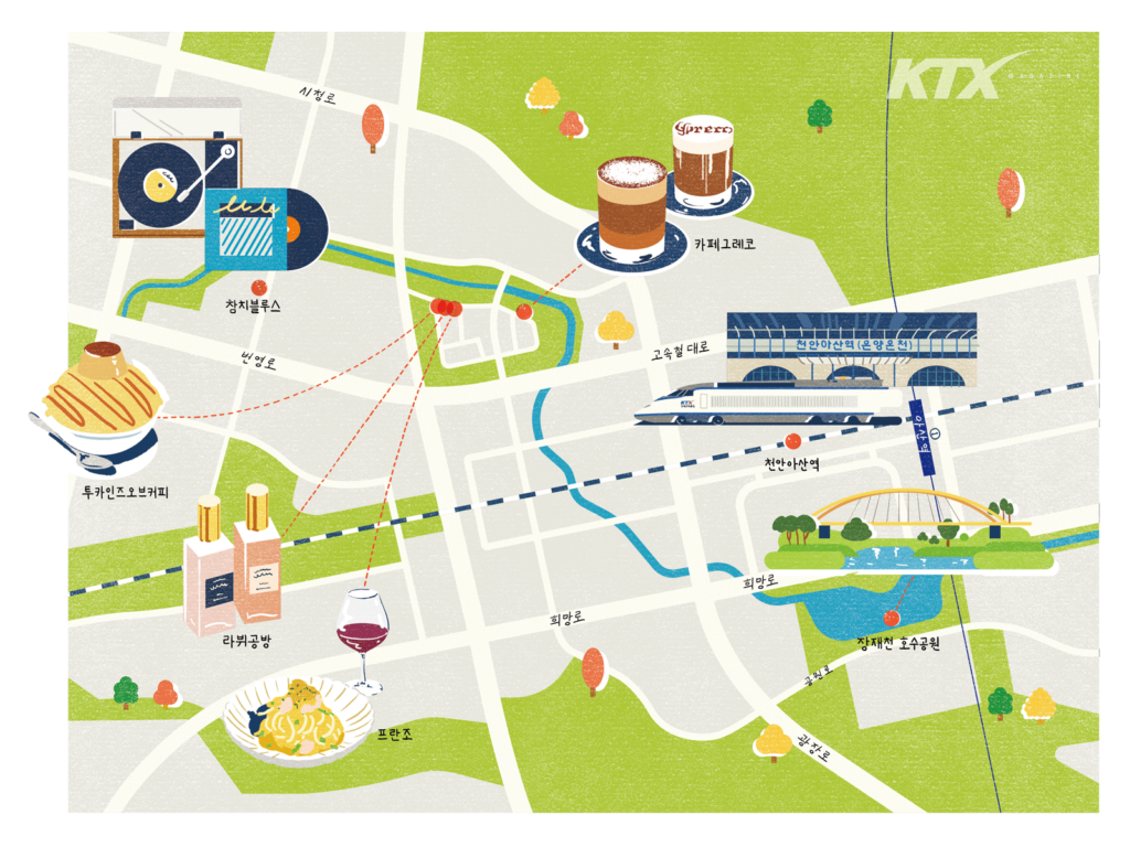 약속 시간보다 빨리 도착했을 때 시간 보낼 곳을 찾던 경험은 누구에게나 있을 것이다. 여름에는 뜨거운 햇볕을 피해 실내를, 겨울에는 몸을 따뜻하게 녹여 줄 공간을 물색하겠지만 가을은 밖에서 기다려도 충분히 좋은 계절이다. 천안아산역 광장과 이어지는 장재천 호수공원의 노란 다리가 보인다면 주저 없이 걸음을 옮기자. 장재천 호수공원은 평범한 공원 같아도 자세히 들여다보면 볼거리가 적지 않다. 시원한 물줄기를 뿜어 내는 분수, 다리 위를 지나가는 기차, 물장구치는 청둥오리, 그리고 줄지어 달리거나 강아지와 함께 산책하는 사람들. 일상적인 풍경을 감상하는 동안 금세 시간이 지나간다. 건너편에는 천안시와 아산시가 함께 설립하고 운영하는 천안아산상생협력센터 도서관이 있으니 책을 읽으며 기다려도 좋다. 만나기로 한 이가 도착했다는 연락이 오면 이렇게 답장을 보내자. “노란 다리에서 만나.”