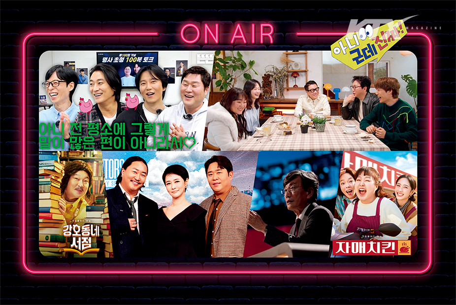 OTT로 확장되고 TV로 돌아온 토크쇼는 기존 토크쇼는 물론 유튜브 토크쇼와도 차별화를 꾀하는 중이다. 이들 프로의 공통점은 토크에 상황극과 콘셉트를 더해 예능 요소를 강화했다는 것이다. <김주하의 데이앤나잇>은 아나운서 김주하의 이름을 걸었으나 개그맨 문세윤, 가수 조째즈와 함께하면서 ‘뉴스의 깊이와 예능의 유연함을 결합한 토크테인먼트’를 지향한다. 김주하가 매거진 편집장, 그리고 문세윤과 조째즈가 에디터가 되어 각계각층의 셀럽을 인터뷰하는 형식인데, 김주하가 상황극으로 애교 연기를 펼치는 등 전에는 상상도 못 할 장면이 연출된다. <아니 근데 진짜!>는 ‘감옥’과 ‘소개팅’이라는 독특한 콘셉트로 토크와 함께 게임, 상황극 등을 버무리고, <자매다방>과 <자매치킨>은 이수지와 정이랑의 농익은 상황극 연기로 빛을 발하는 중이다. 최근 시작한 <강호동네서점> 역시 강호동이 소크라테스의 제자인 불멸의 존재 ‘호크라테스’가 되어 책방에서 손님을 맞는다는 상황을 설정했다.