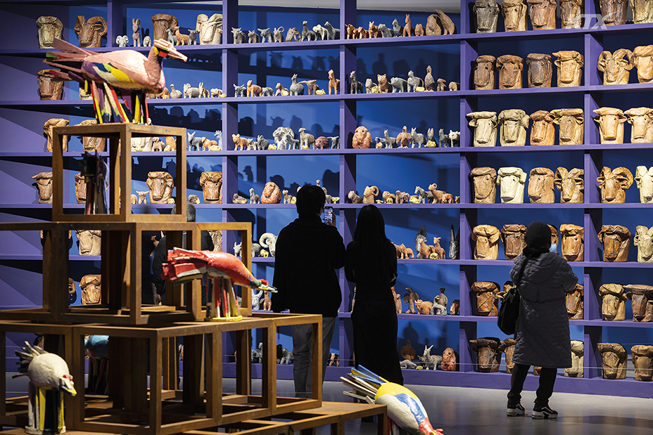 4부 ‘사물과의 대화’ 섹션에서는 작가가 아프리카, 중국, 영국 등 세계 곳곳을 방문해 수집한 공예품을 전시한다. 작가에게 수집은 단순한 취미나 장식이 아니라 창작의 원천이고, 작가는 이질적 요소들을 결합해 특유의 조형 언어로 확장했다.