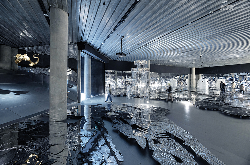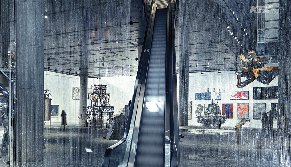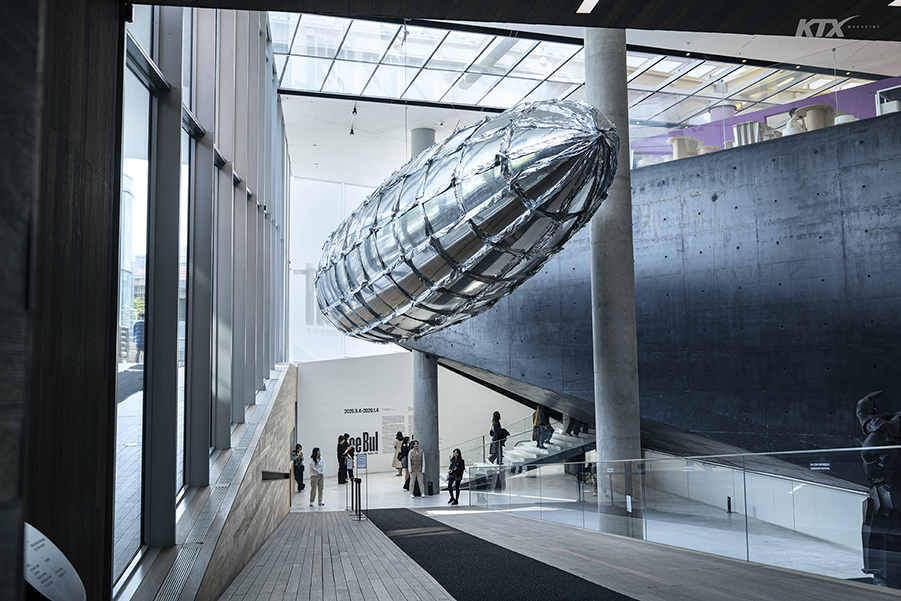 전시장에 들어서는 순간, 이 열기가 단순히 이름값 때문만은 아님을 실감한다. 이불의 작업이 주는 시각적 충격은 즉각적이고 강렬하다. 전시장 입구 슬로프 공간에 매달린 길이 17미터에 달하는 은빛 비행선이 시선을 압도한다. 20세기 초 독일 기술 발전의 상징이자 비행선의 대명사였지만 충격적인 폭발 사건으로 역사 속으로 사라진 체펠린 비행선을 참조한 이 반짝이는 비행선은 기술 진보에 대한 인류의 열망과 좌절을 동시에 상징한다. 그러나 이 역사적 맥락과 함의를 모르더라도 상관없다. 렘 콜하스의 블랙 콘크리트와 어우러지며 부유하듯 미세하게 흔들리는 비행선 아래로 걸어 들어가는 순간, 기묘한 경험이 시작된다. 현란하고도 위험한 이불의 세계다.