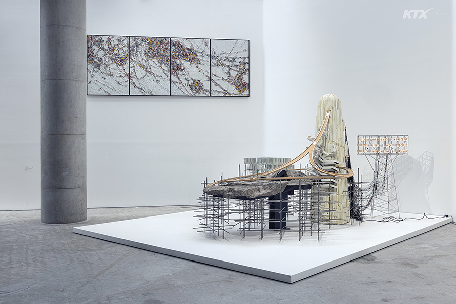 그렇게 ‘블랙박스’라고 불리는 전시 공간으로 들어서면 눈앞에 대규모 거울 설치 작업 ‘태양의 도시 II’가 펼쳐진다. 무한히 반사되는 암흑의 공간 사이에 작가의 초기 대표작들이 흩뿌려지듯 배치되어 있는데, 하나하나 살펴보기도 전에 이미 그 혼란스러운 세계에 깊숙이 빨려든다. 어쩌면 조금 난해하다고 느껴질 법한 풍경 앞에서 지레 겁먹을 필요는 없다. 작가는 “영화를 보듯 ‘신(scene)’을 만들고 관객을 그 안으로 초대하고 싶었다”고 말한다. “타임리스(timeless), 어느 시간대인지 모르겠는, 과거이기도 하고 현재이기도 한 장면을 연출하려고 했다”는 의도는 정확하게 맞아떨어졌다. SF 영화 속 한 장면에 들어온 듯하지만 이게 유토피아적 신인지 디스토피아적 신인지, 도시인지 폐허인지, 미래인지 과거인지, 심지어 아름다운 건지 추한 건지 알 수 없는 묘한 감상에 빠지게 되는 것이다.