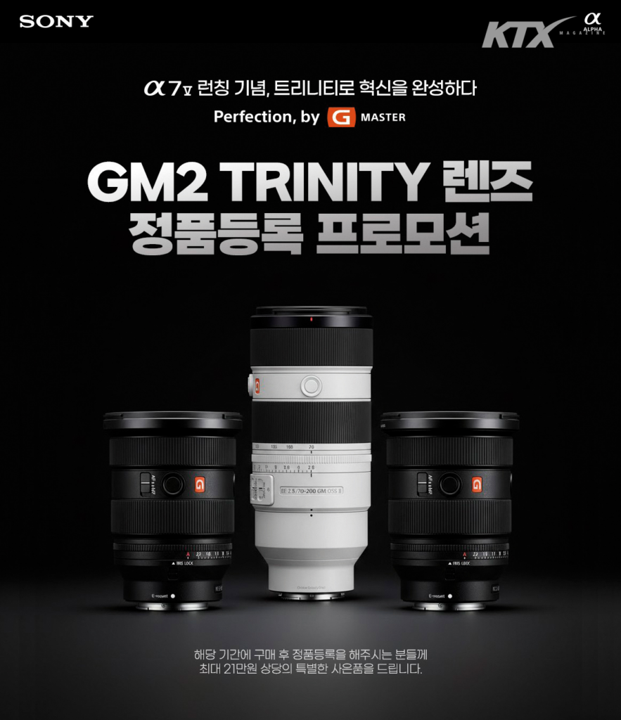소니코리아가 풀 프레임 카메라 시장에서 역대 최고 판매량을 기록한 알파 7 시리즈의 신규 모델인 ‘알파 7 Ⅴ’ 론칭을 기념해 3월 2일까지 GM2 트리니티 렌즈 정품 등록 프로모션을 진행한다. 이번 프로모션은 광각렌즈의 새로운 기준을 제시한 SEL1635GM2, 미래형 렌즈의 완성형인 SEL2470GM2, 망원렌즈의 새 패러다임을 연 SEL70200GM2 등 3종의 렌즈를 대상으로 한다. GM2 트리니티 렌즈는 뛰어난 해상력과 빠른 AF 속도, 경량화 설계로 사용자들에게 높은 평가를 받고 있다.