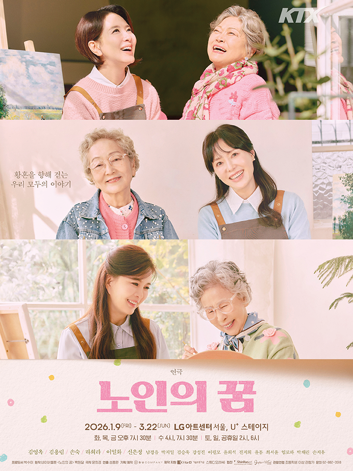 수많은 독자의 마음을 울린 웹툰 <노인의 꿈>이 연극으로 재탄생했다. 원작의 주인공인 미술 학원 원장 봄희 역에 하희라·이일화·신은정이 출연하고, 영정 사진 대신 사용할 자화상을 그리고 싶다며 학원을 찾아온 노인 춘애 역은 김영옥·김용림·손숙이 맡아 열연한다. 현실적이면서도 동화 같은 이야기가 무대 위에 펼쳐져 웃음과 감동을 선사하는 작품이다.
