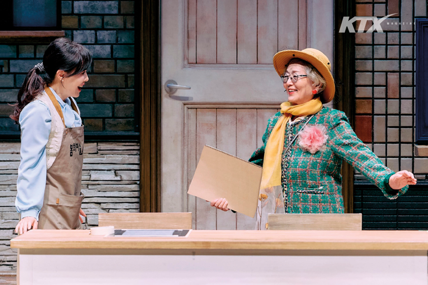 봄희의 굴곡진 서사를 지우니 두 노인의 꿈이 전면적으로 강조된다. 어린 손녀 덕분에 신조어에도 능통한 춘애의 명랑함, 투덜대지만 진심을 전하고 싶어 하는 상길의 마음이 생생하게 살아난다. 춘애가 죽기 전 봄희에게 꽃님과의 관계를 모두 이야기하는 장면을 추가해 둘의 관계가 소중하고 애틋하다는 사실도 드러난다. 봄희의 학생인 춘애가 인생에서는 스승이라는 점도 효과적으로 전달된다. 봄희가 상길과 충돌하고 감정이 폭발하는 장면, 꽃님과 춘애가 함께 인생네컷 사진을 찍는 장면, 상길이 아내의 묘비 앞에서 근사하게 기타를 연주하며 노래하는 장면 등은 원작을 변용하거나 새로 추가한 설정으로, 연극적 문법에 맞춰 인물들 간의 극적인 갈등과 분위기를 최대치로 이끌어 낸다. 이렇게 각색한 덕분에 관객은 ‘노인’과 ‘꿈’이라는 단어가 얼마나 아름답게 조화를 이루는지 충분히 공감한다.