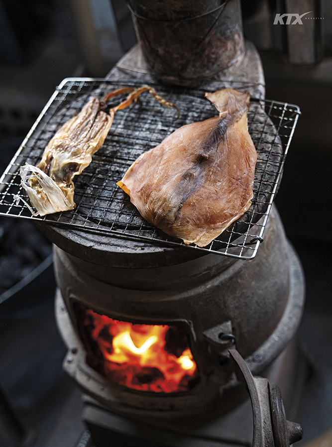 우리 일행이 방문한 날은 열차 점검으로 운행이 중단된 상태. 탑승은 가능하다는 말에 서둘러 열차에 올라탔다. 반지르르 윤기가 흐르는 나무 객차 문과 분홍색의 빛바랜 의자 너머로 마른오징어 굽는 냄새가 훅 덮쳐 온다. 그리고 드디어 모습을 드러낸 무쇠 스토브! 마츠다 부장과 권오준 셰프가 자리를 잡고 앉자 승무원이 다가와 능숙하게 마른오징어를 굽기 시작한다. “와, 이거 진짜 석탄으로 불을 피우네요!” 촤아악 소리를 내며 익어 가는 마른오징어와 어린아이 같은 표정으로 눈빛을 교환하는 두 사람. 건너편에 앉은 일본인 승객은 이미 고소한 오징어를 뜯으며 사케를 마시고 있다. 한국에서 온 한 무리의 취재 팀이 반가운 승무원이 인심 좋게 석탄을 두어 개 더 집어 들어 스토브에 밀어 넣자, 열차 안은 영하의 날씨가 무색하게 뜨거운 열기로 가득하다.