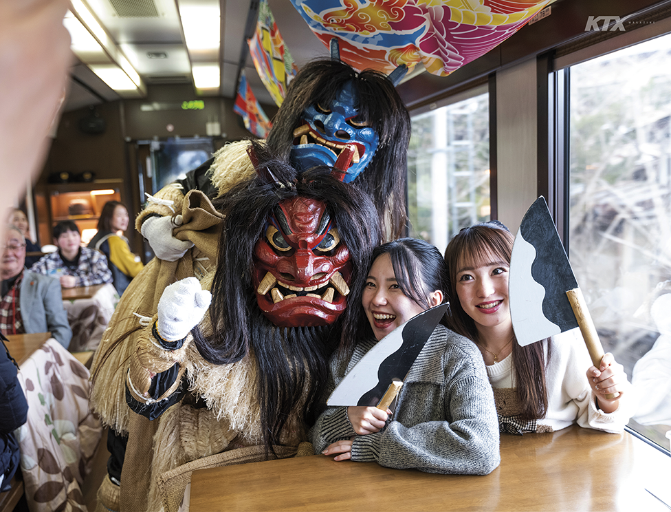 밤색 외관에 도깨비 캐릭터가 부착된 고타쓰 열차에 오르자, 4인용 테이블 아래로 폭신한 이불이 놓인 고타쓰 열두 개가 양옆으로 길게 늘어서 있다. 신발을 벗고 앉아 이불로 무릎을 덮으니 온몸으로 온기가 전해진다. 1시간 40분가량 걸려 총길이 71킬로미터를 운행하는 고타쓰 열차는 지금의 노선을 연결하는 데 무려 88년이 걸렸다고 한다. 이와테현 동쪽 바다를 따라 달리는 고타쓰 열차 창밖으로는 일본에서도 손꼽히는 절경인 리아스식해안이 펼쳐진다. 아치형의 오사와 교량도 결코 놓칠 수 없는 볼거리. 고타쓰 열차가 이 구간을 달릴 때는 사진을 찍을 수 있도록 속도를 늦춰 준다. 맛있는 에키벤을 먹으며 창밖 풍경에 넋을 잃은 사이, 갑자기 열차 내 전등이 모두 꺼지면서 험상궂은 탈을 쓴 존재가 등장한다.