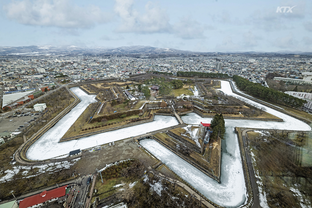별 모양의 서양식 요새 고료카쿠는 하코다테에서 꼭 봐야 하는 필수 스폿. 고료카쿠 타워는 고료카쿠를 가장 완벽하게 조망할 수 있는 최적의 장소다. 엘리베이터를 타고 높이 90미터의 고료카쿠 타워 전망대에 오르면 오각형의 별 모양 성곽이 두 눈에 담긴다. 고료카쿠는 근대식 화력전에 대응하기 위해 설계된 일본 최초의 서양식 요새. 1860년대에 지어진 별 모양 성곽으로 사각지대를 없애 적의 접근을 모든 방향에서 감시하고, 강력해진 화포 공격에 대비해 성벽의 높이를 낮추는 대신 해자를 깊게 파고 돌출된 모서리마다 포대를 배치했다. 고료카쿠 타워 전망대 2층에는 고료카쿠 준공 당시의 모습을 정확하게 재현한 모형과 함께 ‘고료카쿠 역사 회랑’이라 불리는 전시 공간이 있다. 고료카쿠는 하코다테 시민과 여행자 모두에게 훌륭한 산책 코스이기도 하다. 봄에는 다이쇼 시대부터 심은 왕벚나무 1600여 그루가 분홍빛 별을 만든다. 고료카쿠 타워 입장료는 어른 1200엔이며 운영 시간은 오전 9시부터 오후 6시까지다.