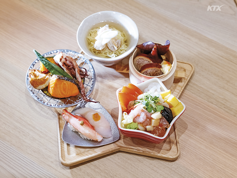 먼저 2층 개찰구 정면에 위치한 홋카이도 시키사이관에서 도시락을 사기로 했다. 마츠다 부장과 권오준 셰프가 고른 메뉴는 하코다테산 식재료로 만든 두 종류. 말린 청어를 간장에 조린 것에 청어알과 미역 줄기를 더한 니싱 미가키 벤토와 작은 오징어에 밥을 넣어 한국의 오징어순대처럼 만든 이카메시다. 여기에 깔끔하고 청량한 맛의 사케 한 병을 추가하니 근사한 도시락 세트가 완성됐다.