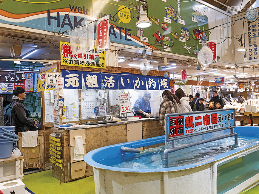 하코다테 여행 중 한 번은 로컬 시장에서 아침 식사를 해 보는 것도 좋다. 하루를 활기차게 시작하는 상인들 틈에 끼어 하코다테의 제철 해산물을 구경하고, 그중 마음에 드는 메뉴를 골라 즉석에서 먹는 즐거움이 특별하기 때문이다. 3만 3000제곱미터의 넓은 부지에 250여 개 점포가 밀집한 하코다테 아침시장은 하코다테의 미식 문화를 온몸으로 체험하는 테마파크와 같다. 길게 이어진 골목을 따라 안으로 들어서면 하코다테의 명물인 오징어 조형물이 설치된 오징어 낚시 체험 코너가 시선을 사로잡는다. 1인당 2000엔(당시 시가)을 내면 수조에서 헤엄치는 오징어를 낚싯대로 잡는 체험을 할 수 있으며, 직접 잡은 오징어를 즉석에서 회로 손질해 준다. 입에 착 붙는 오징어 회는 은은한 단맛이 난다. 홋카이도의 보물이라고 불리는 성게알, 톡톡 터지는 식감이 일품인 연어알, 그리고 보드라운 게살이 산처럼 쌓인 해물 덮밥으로 아침 식사를 해도 좋다. 식사를 마치고 나면 본격적으로 시장 구경을 할 차례. 하코다테 아침시장에서 단 하나의 특산품을 사야 한다면 최고급 다시마, 마콘부를 추천한다. 잎이 넓고 두꺼워 국물을 냈을 때 맑고 진한 감칠맛이 나는것이 특징이다. 예로부터 교토 등에서 귀하게 여겨졌으며, 헌상품으로도 취급되었다.