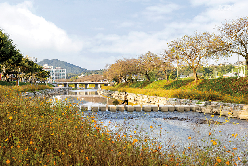 차가운 새벽 공기를 들이마시며 하루를 시작하거나 한 끼 든든히 먹고 산책할 곳이 필요할 때, 또는 해 질 무렵 노을에 붉게 물든 구름을 감상하기 위해 여행자는 산책로를 찾는다. 특히 가을은 낯선 여행지에서 느긋하게 산책을 즐기기에 최적의 계절이라, 바람을 만끽하러 나온 사람들을 곳곳에서 마주하게 된다. 계절마다 각기 다른 색으로 물드는 양지천은 혼자만의 여유로운 시간이 필요한 사람에게 괜찮은 선택지일 테다. 한동안 방치되었던 양지천은 경천·양지천 수변 종합개발사업으로 볼거리가 풍성한 꽃길로 변화하고 있다. 봄에는 벚꽃을 비롯해 꽃잔디, 수선화, 튤립이 하천 주변을 가득 메우고 여름부터 가을까지는 황화코스모스와 버들마편초가 산책자를 반긴다. 황화코스모스가 흐드러진 길 사이를 거닐면 황금 길을 지나는 기분 좋은 착각에 빠진다. 양지천이 순창의 새로운 산책 명소로 떠오르면서 올해 ‘사계절 양지천에 반하다’를 주제로 사진 공모전이 처음 열렸고, 참두릅을 테마로 한 먹거리와 체험, 공연이 어우러진 제1회 순창 참두릅 여행 축제도 하천 일대에서 개최했다. 아름다운 꽃이 가득한 곳에는 사람이 모여드는 법이다.
