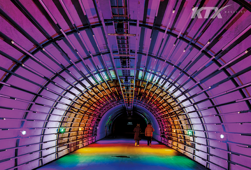 태백산 자락에 자리한 통리탄탄파크는 폐광한 한보탄광을 산업 유산으로 보존하는 동시에 예술로 승화시킨 공간이다. 깊고 어두운 갱도 두 곳이 터널형 전시관 ‘기억을 품은 길’과 ‘빛을 찾는 길’로 탈바꿈했다. 갱도의 옛 모습을 고스란히 간직한 ‘기억을 품은 길’ 안으로 들어서자 서늘하고 고요한 공기가 감돈다. 안전모를 쓰고 석탄을 캐러 가던 광부의 숨결이 느껴지는 듯하다. 더 깊이 들어갈수록 밝은 LED 조명과 인터랙티브 작품이 폐광의 어둠을 화려한 색과 움직임으로 채운다. ‘기억을 품은 길’ 전시관에는 탄광이 생기기 전 고생대 화석의 보고인 태백의 땅속 풍경이 벽화로 조성되어 있다. 363미터 길이의 ‘기억을 품은 길’ 밖으로 나오면 산책로인 천산 고도가 약 1킬로미터 뻗어 있다. 산책로 중간에 태백산 자락이 내려다보이는 탄탄카페가 있어 커피 한잔의 여유를 즐기기 좋다. 산책로 끝은 전시관 ‘빛을 찾는 길’로 이어진다. 갱도 안은 어둠을 걷어 내고 다채로운 빛과 인터랙티브 영상이 펼쳐지며 밝은 미래로 나아가는 여정이 시작되는 듯하다. 613미터 길이의 갱도라는 제한된 공간이 빛의 효과를 극대화해 몰입감을 선사한다.