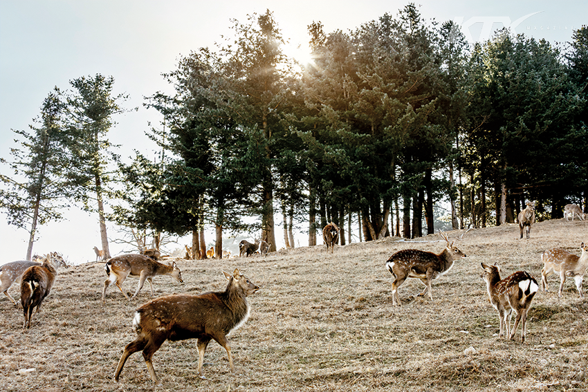 “사슴들이 자유롭게 뛰노는 곳에 사람들이 잠시 들어와서 교감할 수 있어요.” 대를 이어 초록뿔언덕 사슴목장을 운영하는 이상봉 대표의 말이다. 이곳에는 무려 200여 마리의 꽃사슴이 살고 있다. 청청한 기운이 감도는 30만 제곱미터 고원에서 마음껏 뛰노는 꽃사슴 무리가 인상적이다. 초록뿔언덕 사슴목장은 30년 전인 1990년대 중반부터 방목 사육을 고수했다. 스트레스 없이 자란 사슴의 녹용을 팔기 위해서였다. 대학생 시절부터 목장에서 일하며 가업을 이어받은 이 대표는 목장에 관광을 접목시키기 위해 방목 사육에서 방목 생태 축산 목장으로 한 단계 업그레이드했다. 태백을 찾은 여행자가 자연 방목하는 꽃사슴을 볼 수 있도록 방목지에 산책로를 조성하고 언덕 위에 전망대를 설치했다. 목장에서 여유롭게 쉬어 갈 수 있도록 2023년엔 초록뿔언덕 카페도 오픈했다. 삼면을 유리로 마감해 초원에서 뛰노는 꽃사슴이 생생하게 보인다. 말차크림라테에 사슴뿔 모양 스푼을 꽂은 초록뿔라테와 쌍화차에 녹용이 들어간 쌍용차 등 메뉴에도 사슴 농장의 정체성을 담았다. 창가에 앉아 커피를 홀짝이며 귀여운 꽃사슴을 눈에 담는 일은 초록뿔언덕에서만 누릴 수 있는 호사다. 오후 3시, 먹이 주는 시간에 목장을 걸으면 더욱 가까이서 꽃사슴과 눈을 맞출 수 있다.